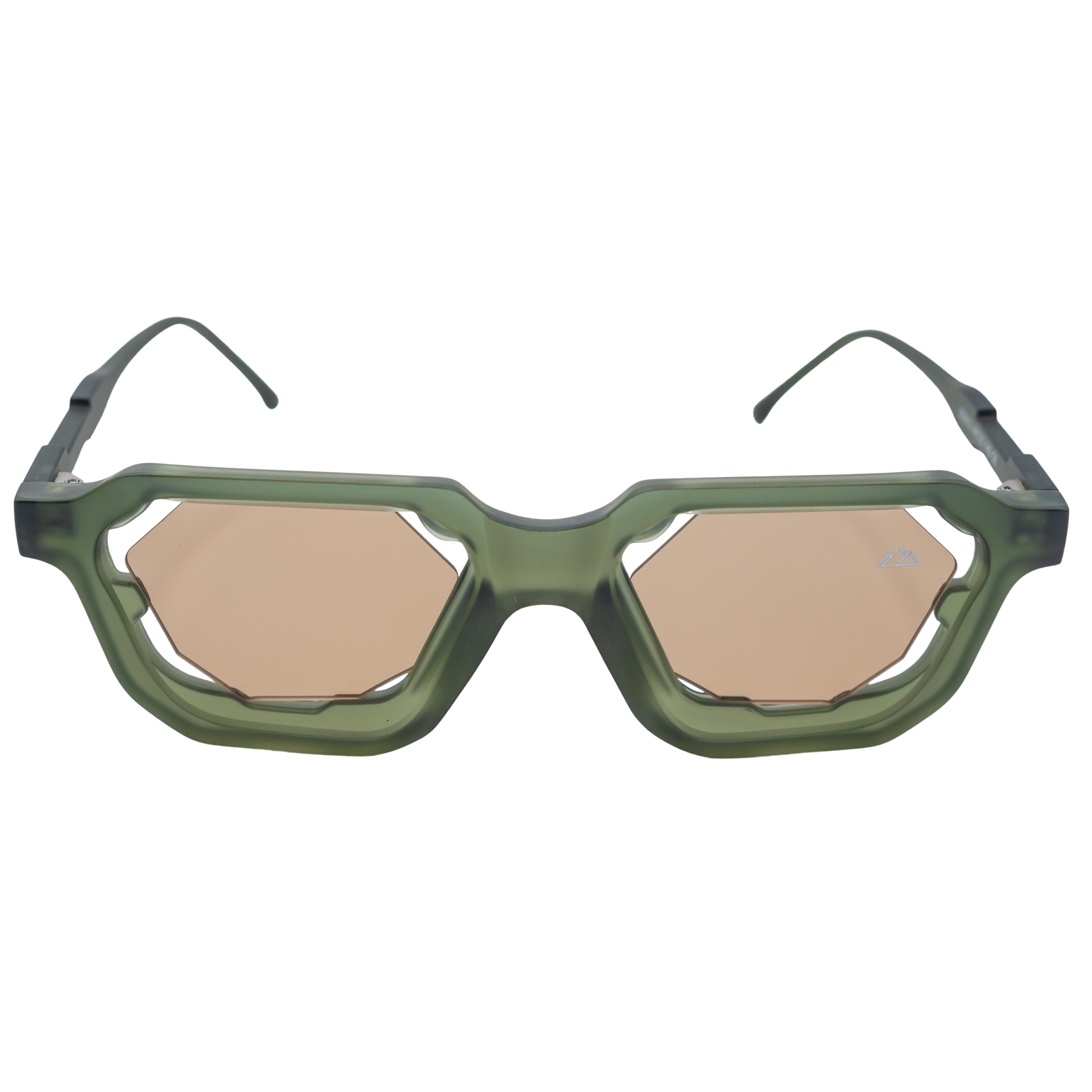 Óculos de sol unissex, estilo hexagonal irregular, com armação na cor verde e lentes na cor rosê. Possui proteção contra raios UVA e UVB.
